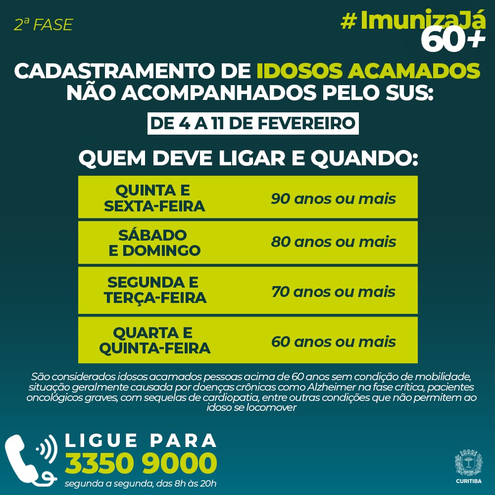 Pessoas com 50 anos completos ou mais; Também é necessário fazer o cadastro antecipado na plataforma saúde já, pelo site (www.saudeja.curitiba.pr.gov.br) ou pelo aplicativo do celular. A partir de agora a secretaria irá adotar a convocação para a vacinação pelo ano de nascimento e não mais pela idade. De acordo com a prefeitura, são aguardadas cerca de 17,5 mil pessoas. Nascidos entre 1º de julho e 31 de dezembro.